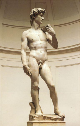 此雕塑為大理石雕像,高3.96米,連基座高5.5米。該雕像展現(xiàn)了一個年輕有力的裸體男子形象,體態(tài)健美、神情堅定、肌肉飽滿、有生命力,似乎能夠感覺到人物身體血管的跳動,更突出了大衛(wèi)作為一名英雄的高大形象。