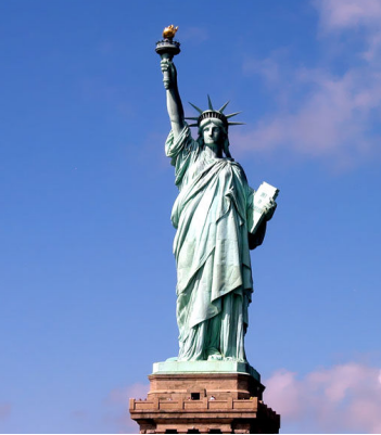 自由女神像重45萬磅,高46米,底座高45米,整座銅像以120噸鋼鐵為骨架,80噸銅片為外皮,30萬只鉚釘裝配固定在支架上,總重量達225噸。自由女神像穿著古希臘風格服裝,頭戴光芒四射冠冕,七道尖芒象征七大洲。 右手高舉象征自由的火炬,左手捧著《獨立宣言》:腳下是打碎的手銬,腳鐐和鎖鏈,象征掙脫暴政的約束和自由。自由女神像是以法國巴黎盧森堡公園的自由女神像作藍本,法國著名雕塑家巴托爾迪歷時10年艱辛完成了雕像的雕塑工作,女神的外貌設計來源于雕塑家的母親,而女神高舉火炬的右手則是來源于雕塑家妻子的手臂。
