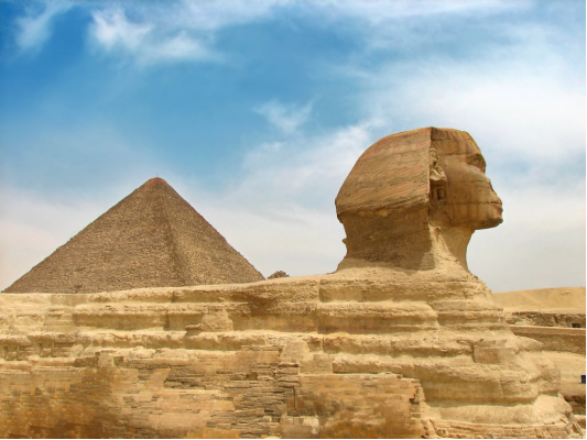 獅身人面像(又譯“斯芬克斯”),坐落在開羅西南的吉薩大金字塔近旁,是埃及著名古跡,與金字塔同為古埃及文明最有代表性的遺跡。像高21米,長57米,耳朵就有2米長。除了前伸長達15的獅爪是用大石塊鑲砌外,整座像是在一塊含有貝殼之類雜質的巨石上雕成。面部是古埃及第四王朝法老哈夫拉的臉型。相傳公元前 2611年,哈夫拉到此巡視自己的陵墓——哈夫拉金字塔工程時,吩咐為自己雕鑿石像。工匠別出心裁地雕鑿了一頭獅身像,而以這位法老的面像作為獅子的頭。在古埃及,獅子是力量的象征,獅身人面像實際上是古埃及法老的寫照。雕像坐西向東,蹲伏在哈夫拉的陵墓旁。由于它狀如希臘神話中的人面怪物斯芬克斯,西方人因此以“斯芬克斯”稱呼它。