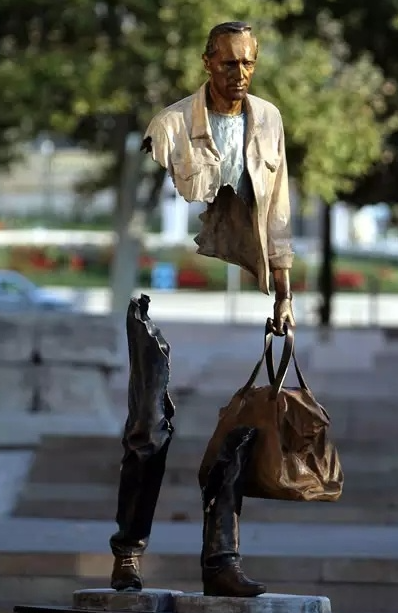 這銅像們手提公文包,穿著相近卻各不一樣,用藝術家的話說:想強調的不是他們擁有什么,而是他們缺失什么,取名“旅人”,更像是對現代城市工作中、工人不完整的靈魂、空洞的生活一種反饋。